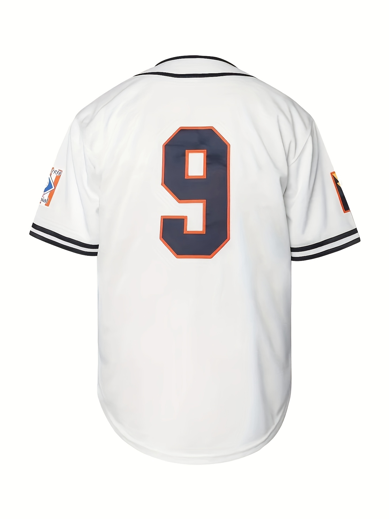 Men's #9 White Baseball Jersey - Fully Embroidered "Knights" Design, V-Neck, Button-Up, Short Sleeve, Loose Fit for Sports, Parties & Casual Wear