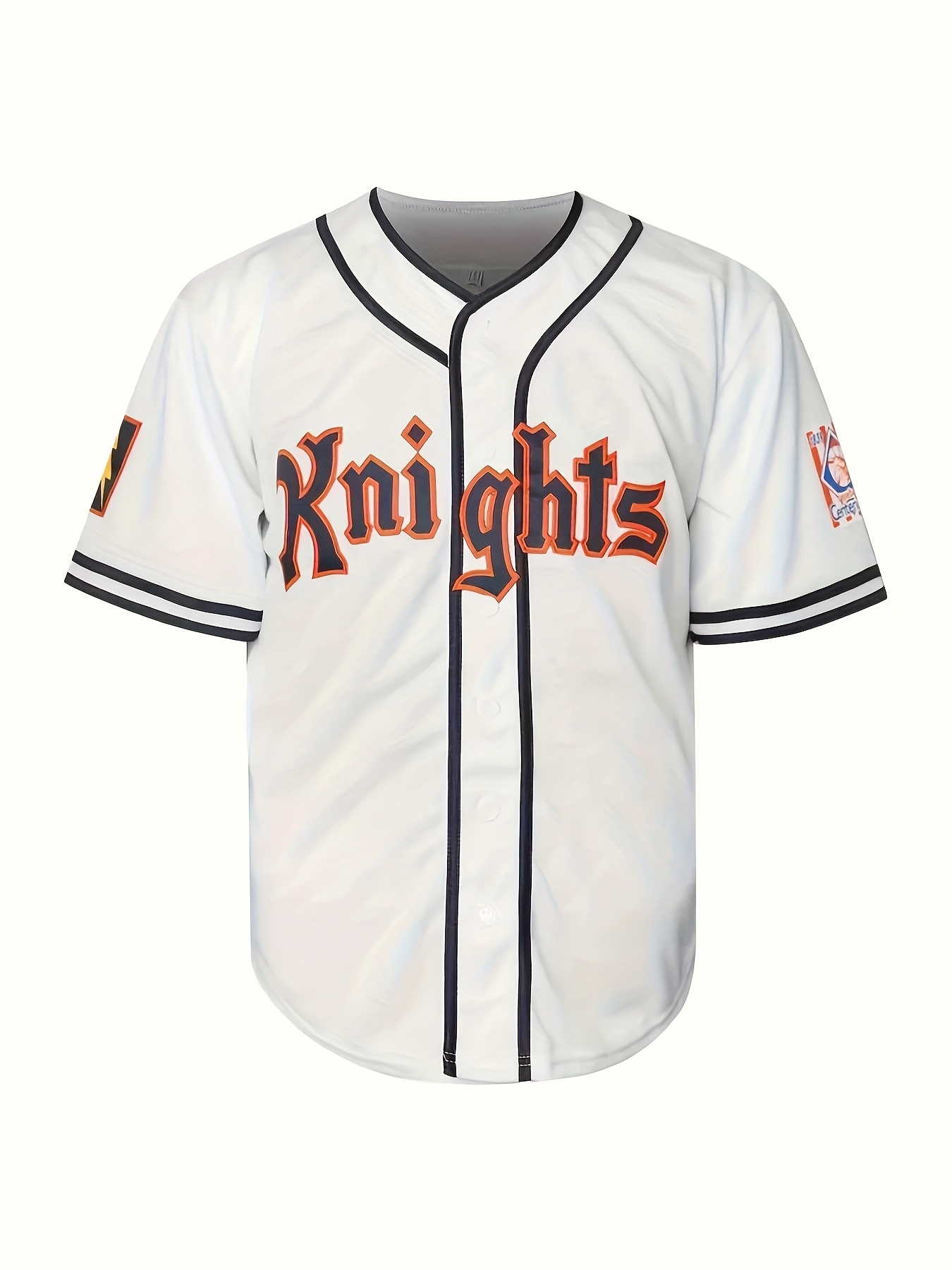 Men's #9 White Baseball Jersey - Fully Embroidered "Knights" Design, V-Neck, Button-Up, Short Sleeve, Loose Fit for Sports, Parties & Casual Wear